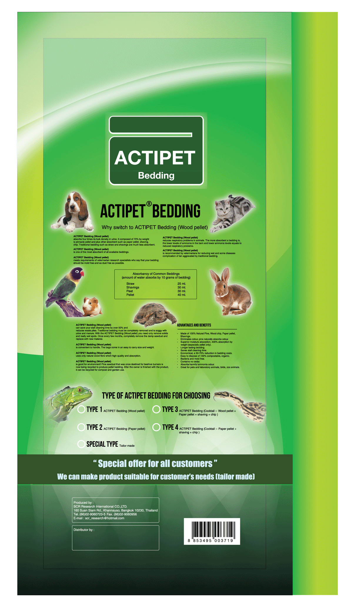 Actipet Bedding ผลิตจากวัสดุธรรมชาติ สามารถดูดซับความชื้น ดูดซับการขับถ่ายของสัตว์ ย่อยสลายได้เองตามธรรมชาติ ไม่มีสารพิษตกค้าง ใช้เป็นวัสดุปูรองพื้นกรงและปูรองนอน มีรูปแบบผลิตภัณฑ์หลายชนิด ได้แก่ ไม้สนอัดเม็ด กระดาษอัดเม็ด แกนปอสับ และขี้เลื่อย มากกว่านั้นทางเรามีวัสดุรองนอนสำหรับสัตว์ที่ใช้ในวิจัยอีกด้วย หรือท่านสามารถเลือกประเภทของวัสดุลองนอนแต่ละประเภทมาผสมกันในรูปแบบที่ท่านต้องการ